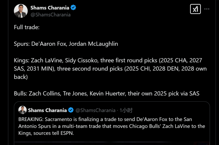 北京时辰2025年2月3日,继昨日东契奇、浓眉互换东家的大来回后,本日NBA又出身了一笔大来回,据名记Shams、Haynes、Sam Amick等东谈主报谈,马刺、国王、公牛闭幕三方大来回,福克斯、拉文等明星球员被来回了。