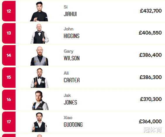 塞尔比名依次4、马克·威廉姆斯第5、肖恩·墨菲第6、卢卡·布雷切尔第7、马克·艾伦第8、丁俊晖第9、张安达第10,在德国大家赛得回亚军的巴里·霍金斯名依次11位。斯佳辉名依次12位,希金斯第13位,加里·威尔逊第14位,阿里·卡特第15位,杰克·琼斯第16位。当今仍然有三位中国球员置身天下前16,而肖国栋在德国大家赛打进四强,距离前16仅一步之遥,他比杰克·琼斯少了6300英镑,接下来的比赛荒谬环节,肖国栋仍有契机纵贯克鲁斯堡。