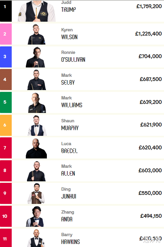 这个冠军让凯伦·威尔逊甩开奥沙利文,以逾越120万英镑的奖金总和稳居第二位,特鲁姆普以近176万英镑的奖金高居榜首,从当今的时局看,就算凯伦·威尔逊冲破克鲁斯堡魔咒,得胜卫冕世锦赛,或许也很难在本赛季非凡特鲁姆普。奥沙利文在本赛季的竞技景况不睬念念,屡次退赛让他停滞不前,暂时位居第三位。