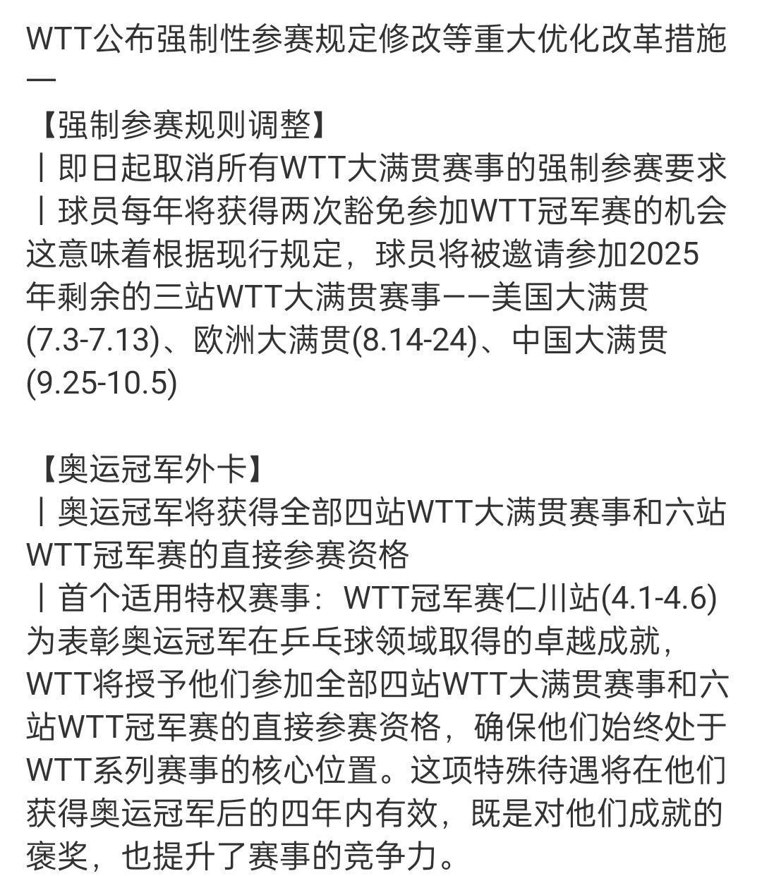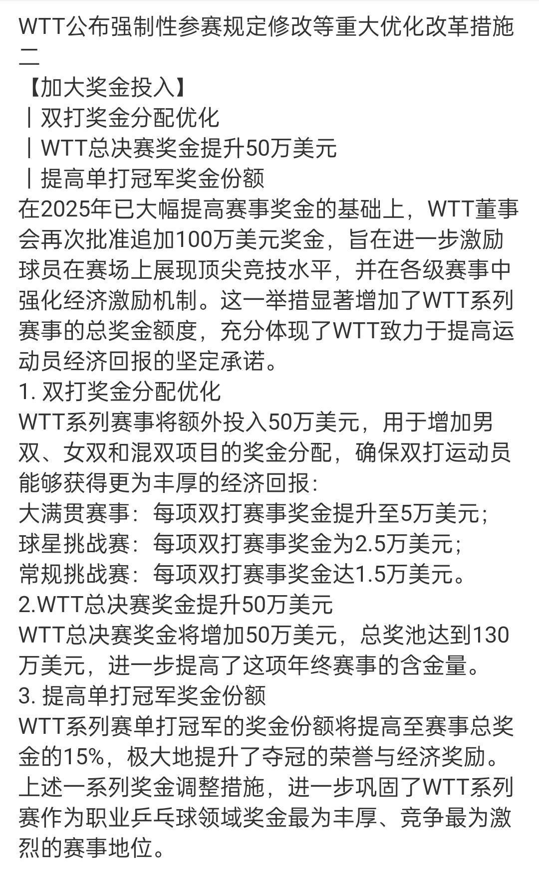 这次优化的发祥其实即是樊振东、陈梦、马龙接连退出宇宙排行,这带来了绝顶的影响,也激发了关于WTT赛制的质疑。WTT官方当今依然优化了规则,固然受益的东谈主好多,但樊振东应该是脚下最疼痛的球员之一。