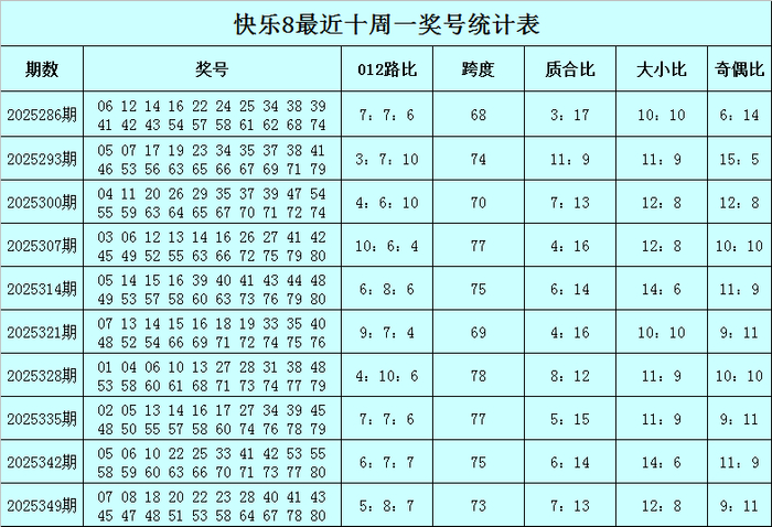 福彩风光8第2025349期(上周一)开奖转头:07 08 18 20 22 23 28 40 41 43 45 47 48 51 53 58 64 67 78 80,其中奖号012路比为5:8:7,跨度为73,质合比为7:13,大小比为12:8,奇偶比为9:11。