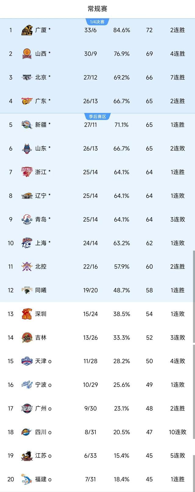 底下就望望CBA最新积分排行,山东掉出前四,季后赛席位的争夺似乎悬念不大,10队提前出线,剩余两个限额极或者率等于北控和同曦,深圳思要逆袭反超照实但愿迷茫。