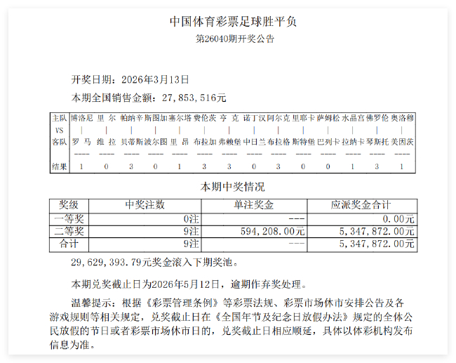 北京手艺3月13日,足彩第26040期开奖成果揭晓。本期足彩14场头奖空开,这是近3期足彩的第2次头奖空开,滚存增至2962万,从而超过第26011期的2258万滚存,为本年最高;14场2等开出9注,单注奖金59.4万;任九开出98注体育集锦,单注奖金10.6万。本期输赢彩销量为27,853,516元,任九投注总和为16,241,168元。