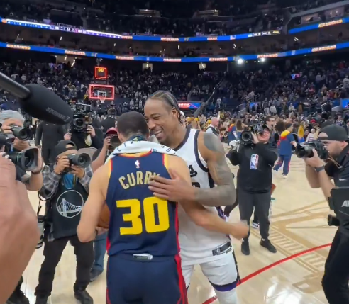 硬汉大捷赛后,德罗赞拥抱道喜库里。