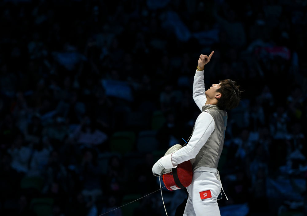 11月19日,香港队选手蔡俊彦在第十五届全运会男人花剑团体金牌赛中庆祝夺金。新华社记者 胡虎虎 摄