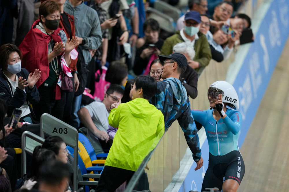 11月17日,香港队选手李念念颖在第十五届全运会形状自行车女子万能赛后与不雅众合影。新华社记者 吴鲁 摄