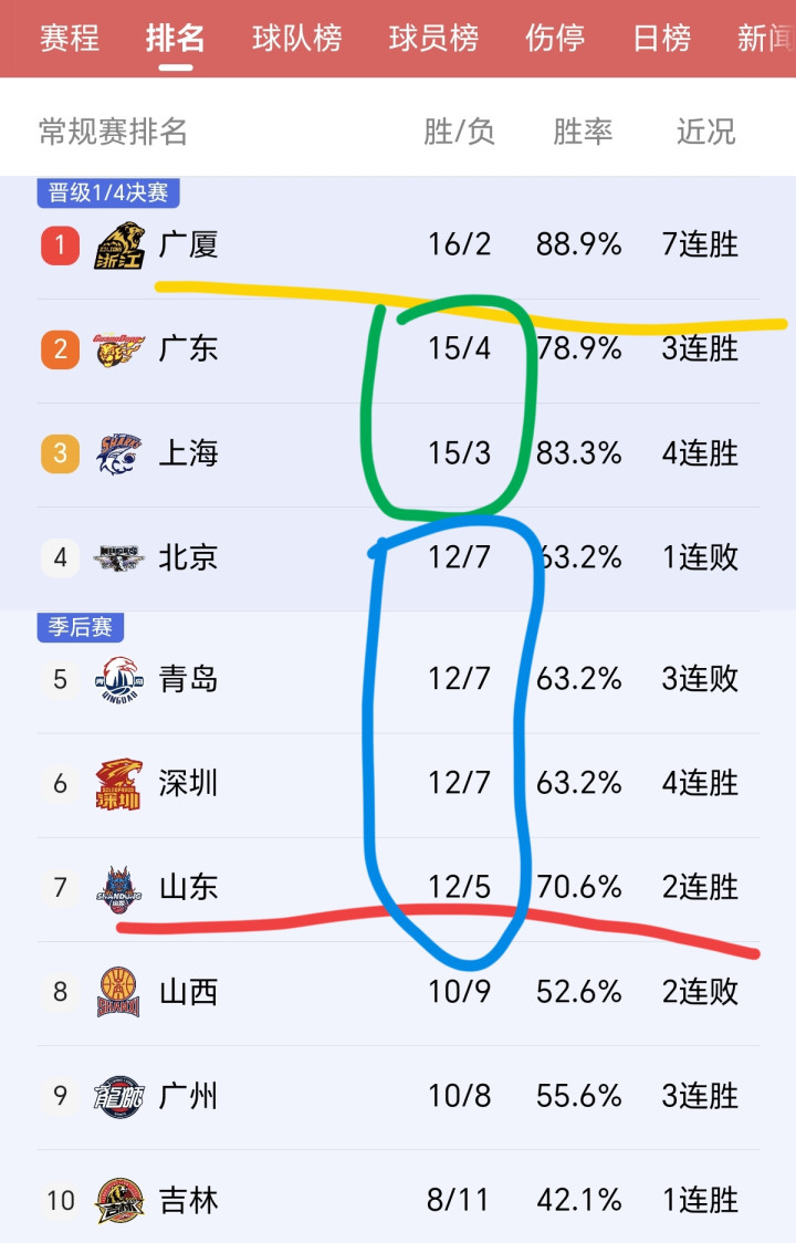 山东的战绩来到13胜5负,排行升至联赛第6,他们的积分和第4的青岛、第5的深圳、第6的北京疏浚。