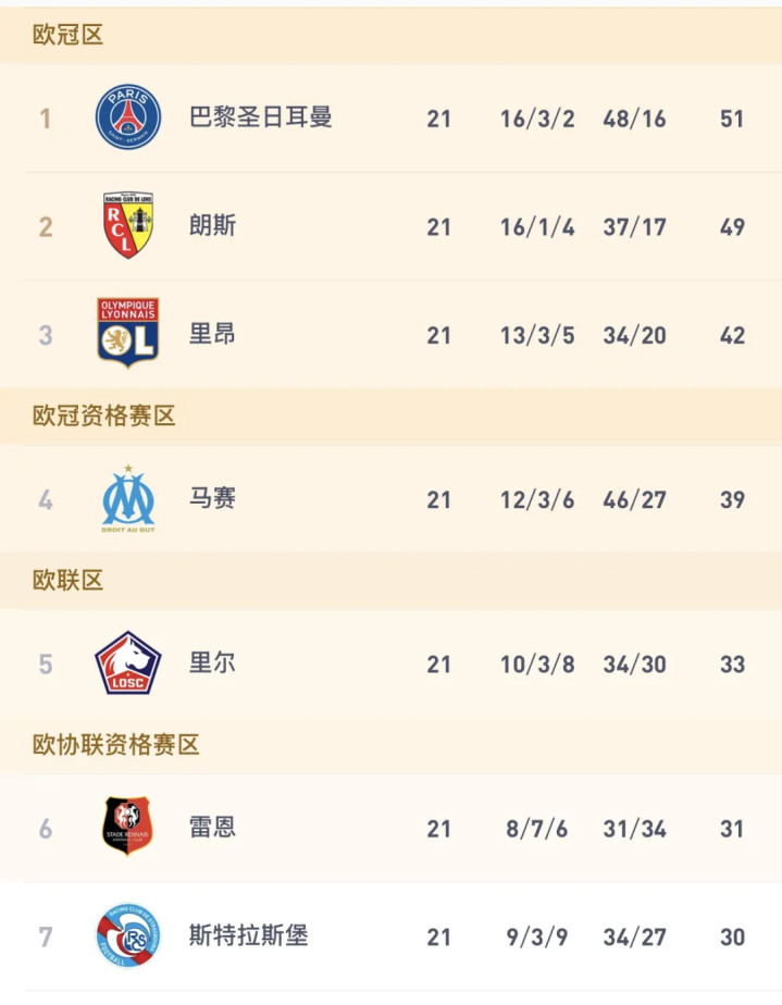 昂热 1-0 图卢兹这是一场价值6分的保级漏洞战。昂热(29分) 告成后,积分榜排行和安全时势得到极大改善。而图卢兹(30分) 失利后,固然暂时无左迁危急,但被拖入了中卑劣混战。勒阿弗尔 2-1 斯特拉斯堡勒阿弗尔(23分) 主场拿下重要3分,这匡助他们进一步拉开了与左迁区的距离。斯特拉斯堡(30分) 则持续踯躅在中游。南特 0-1 里昂南特(14分) 的失利让他们在保级泥潭中越陷越深,与安全区的分差持续扩大。详细赛果与积分榜,本赛季法甲呈现三大赫然战团:争冠双雄会:巴黎圣日耳曼与朗斯(收支2分)造成了明晰的第一争冠集团。其余球队已被甩开至少7分,冠军很可能在这两队之间产生。