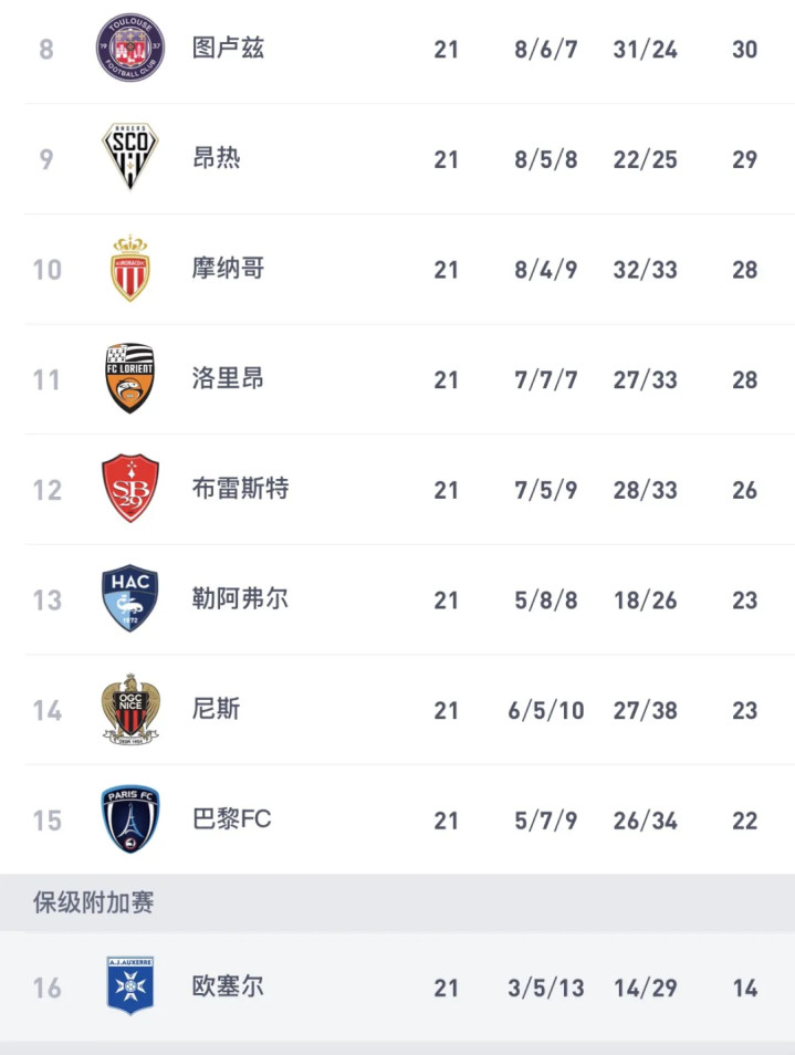 欧战履历混战:里昂(42分) 和 马赛(39分) 组成第二梯队,位置相对踏实。而从第5名里尔(33分) 到第10名摩纳哥(28分),多达6支球队分差仅在5分之内,将为一个欧联或欧协联履历伸开惨烈拼杀。保级时势豁达化:欧塞尔、南特(同积14分) 和梅斯(13分) 已组成左迁危急区,他们与第15名巴黎FC(22分) 至少有8分差距,保级任务极为奋勉。