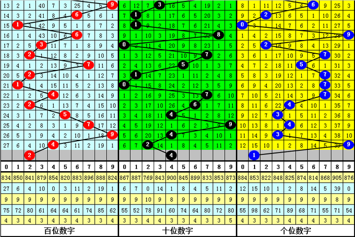 百个位合:前10期百个位两码合开出:9、2、9、8、1、6、8、1、2、3,其中百个位两码合012路比为4:2:4,奇偶比为5:5,本期看好百个位两码合开突出数,防卫两码合3、5、7。