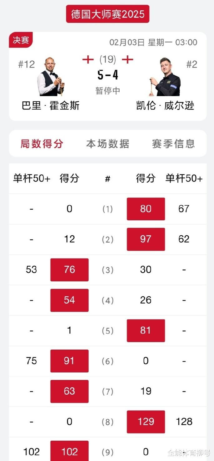 这场决赛第一阶段,威尔逊2-0强势开局,霍金斯很快追成2-2,第一阶段,霍金斯以5-4普及敌手。这个阶段,威尔逊打出单杆128分、67分、62分、霍金斯打出单杆102分、75分、53分。流程几个小时的休息,两边张开第二阶段的争夺,比赛程度依旧胶著体育赛事直播,第十八局适度后,威尔逊以9-8得回赛点,最终以10-9夺得冠军。